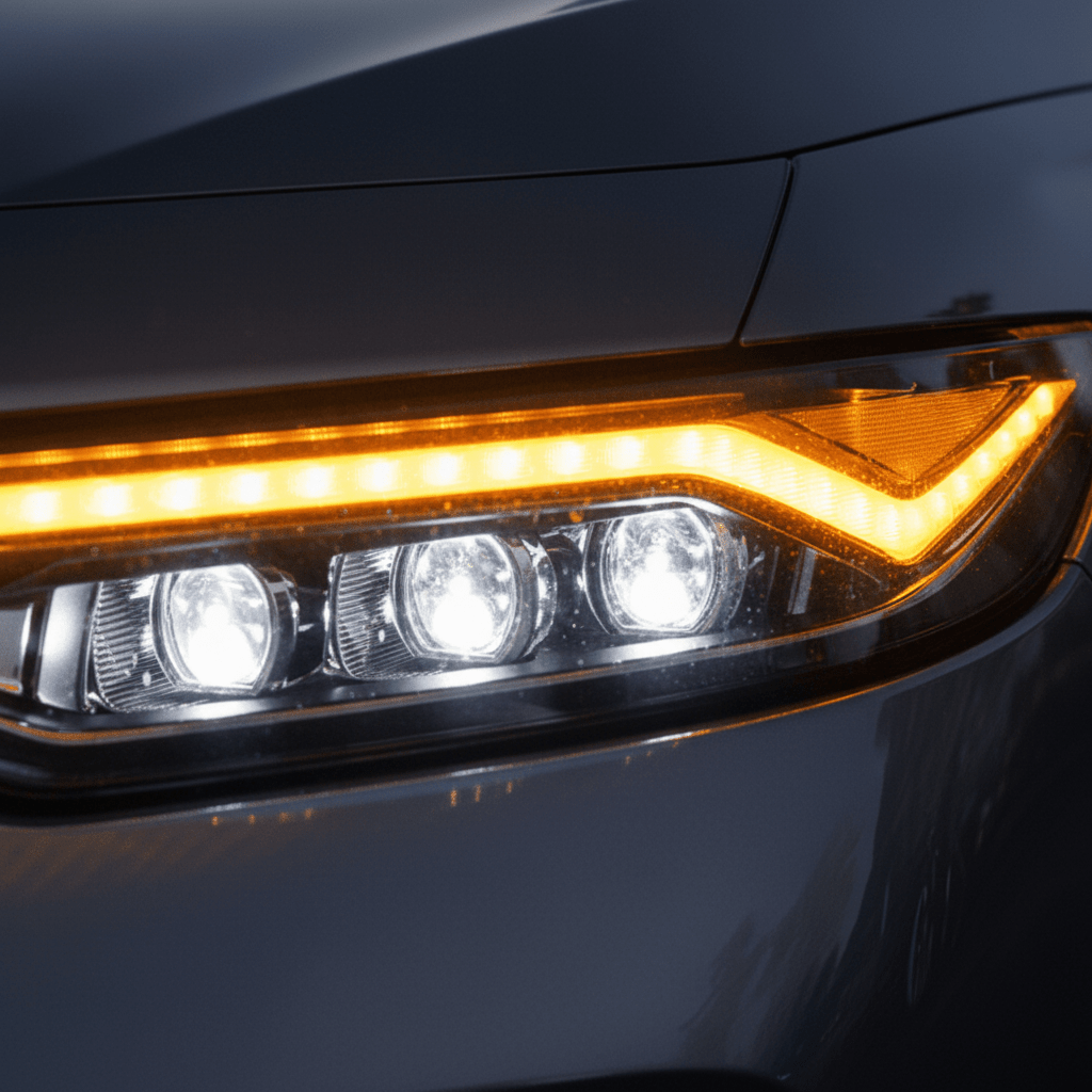 The projector LED layout delivers a cleaner cutoff, stronger forward visibility, and a more focused beam pattern than the factory low-trim lamps, while the DRL signature modernizes the front end without looking overdone.